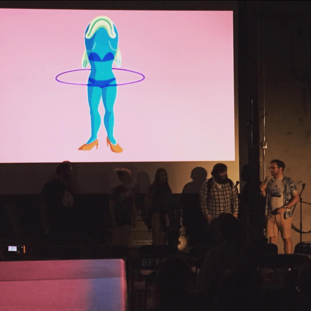 The series was in the alley next to the movie studio’s associated artist loft building, and behind their then on-site restaurant, Terra Firma. About 200-250 seats were put out for each screening, on a professional 17′ outdoor screen, built for the event each week. It was most screened digitally, although Mono No Aware screened 16 millimeter and Super 8 millimeter film. A VHS tape trade fair was held on Horror Boobs’ night and a zine fair was held on Cartuna’s night.
