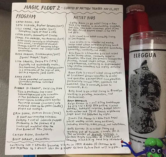 Grannies still whisper about the Magic Floot to put babies to sleep. Its first appearance in 2014 has become legend, but nobody remembers exactly what dress they wore that evening, or whether their horses got stuck in a swamp or to the side of a glacier. Now it returns and not a moment too late… rippling out of mundane reality like an gauntleted fist clutching a bouquet of Goldenrod…! What is FLOOT? a manifestation of the most phantasmagoric, hallucinatory, rare, and brilliant Animations being made today, files ZIPped into rabbit carcasses by a cackling nerd-hag, formed into tinctures, and dribbled before your eyes with exacting precision….the Floot’s second manifestation on this plane can only bring Delight, Enchantment and Revelation as to the miracle that is Animated film!!! Works by CATHY AISON, LILLI CARRÉ, LISA CRAFTS, ERIN DUNN, ANNA FIRTH, BILLY GRANT, ROYA HAROUN, JAMES MERCER, RUBBER O CEMENT, and SETH SCRIVER.